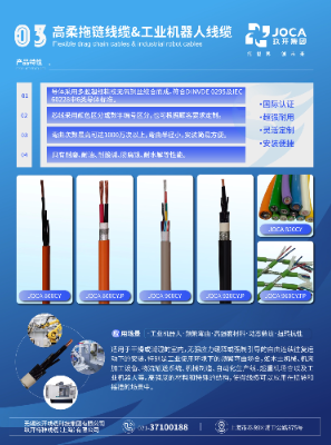 本系列专为高频移动和复杂工况设计,包含 JOCA 800CY, 900CY, 960CY.TP 等型号。 核心性能: 1. 导体采用多股超细精绞无氧铜丝绞合而成,符合DINVDE 0295及IEC60228中6类导体标准。 2. 弯曲次数最高可达1000万次以上,弯曲半径小,安装简易方便。 3. 具有耐磨、耐油、耐酸碱、防腐蚀、耐水解等性能。 4. 芯线采用颜色区分或数字编号区分,也可根据顾客要求定制。 应用领域: 适用于干燥或潮湿的室内,无强应力缓释或强制引导的自由连续往复运动下的安装,特别是工业使用环境下的频繁弯曲场合,如木土机械、机床加工设备、物流输送系统、机械制造、自动化生产线、起重机场合以及工业机器人等。高强度的材料和特殊的结构,使得线缆可以应用在扭转和摇摆的场景中。